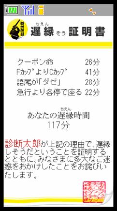 この「チェーンソー診断」とは、映画のキーとなる“チェーンソー”と語感の似ている造語で、縁が遠そうに見えるという意味の「遅縁そう」を診断するコンテンツです。診断結果は“遅(ち)縁(えん)理由”と“遅(ち)縁(えん)時間”をとして、電車の遅延証明書になぞらえた「遅縁そう証明書」で表示します。自分の名前と性別を入力するだけで簡単に診断することができるおもしろ診断です。