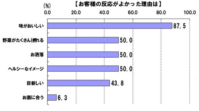 味しい」87.5%、2位「野菜がたくさん採れる」50.0%、「お洒落」50.0%、「ヘルシーなイメージだか
