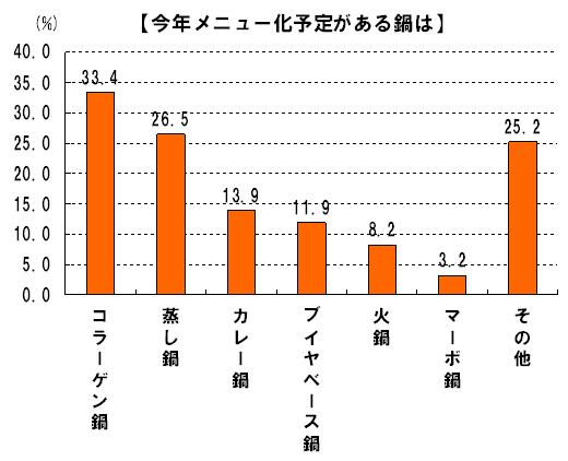 「今年メニュー化を考えている鍋は何かを聞いたところ、1位「コラーゲン鍋」33.4%、2位「蒸し鍋」