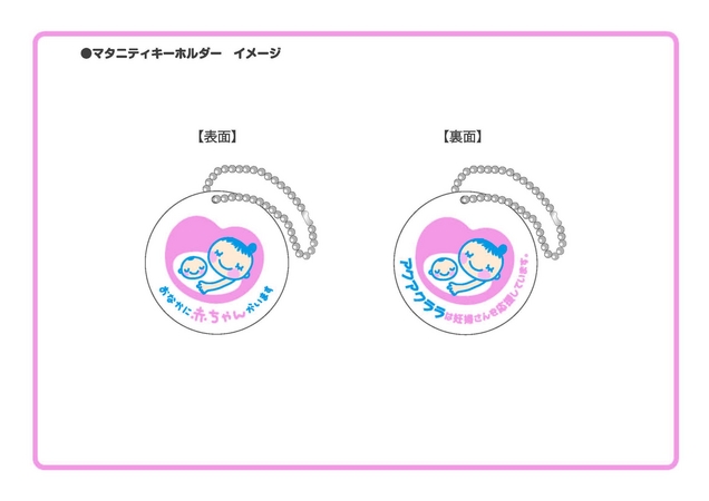 アクアクララはこれまでも、「ベビアクアプラン」など赤ちゃんがいるお母さんやご家族を応援するサービスを展開して参りました。そのような取り組みの一環として、この度作成した「マタニティチェーンホルダー」は、妊婦さんが持ち物につけることによって妊娠していることを周囲に伝えることができ、その周りの人たちが配慮を示しやすくするものです。