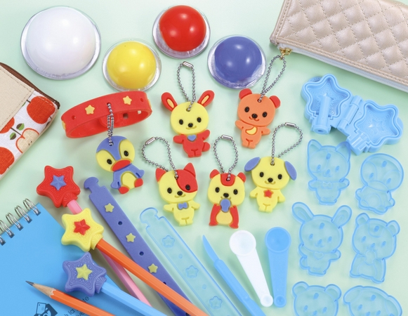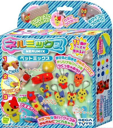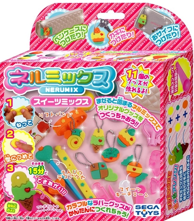 ネルミックスは、玩具業界初の新素材を使った女児向けクラフトホビー玩具です。2種類の素材を粘土のように混ぜるだけの簡単な手順で電子レンジなどを使わず15分で手軽に自分だけのオリジナルラバーグッズが作れます。同梱の型を使えば、スイーツやペットのキーチェーンやリストバンド、えんぴつのデコアクセも作れる他、工夫次第では、ipodケース、リストバンド等の市販のシリコン商品へのデコレーションも可能です。