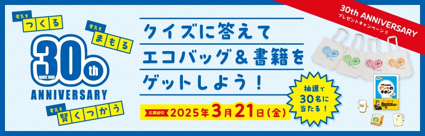 日本テクノは2025年4月4日、設立30周年を迎えます。電気保安からはじまり、今では電気に関するトータルソリューションサービスを展開しています。これまでのご支援・ご愛顧への感謝の気持ちをこめて、今回は30周年を記念したプレゼント企画をご用意いたしました!クイズにお答えいただいた方のなかから抽選で30名さまに、日本テクノオリジナルエコバッグ&書籍『イチから学ぼうデンキのキホン』(日本テクノ・編)をプレゼントします。「電気ってそもそも何?」「電気が使われるようになった歴史は?」など、電気の基礎知識を知りたい学生さんや社会人の方にぜひ手に取ってほしい一冊です。どなたでもご参加いただけますので、奮ってご応募ください。