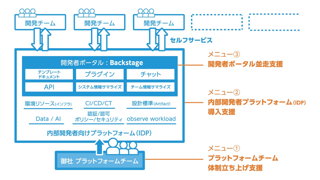 DevOpsを長年に渡り支援する中で培ってきた、クラウドネイティブを中心としたモダンな技術とそれに適した組織体制構築のためのノウハウを活かし、プラットフォームエンジニアリングの組織体制構築やシステムの開発・構築・運用の並走支援に留まらず、テンプレートの提供やプラグインの開発などPlaTTの拡張を並走で支援します。