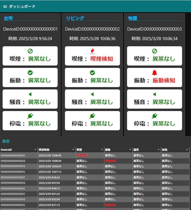 ・各センサー(煙・騒音・振動・停電)のリアルタイム検知状況