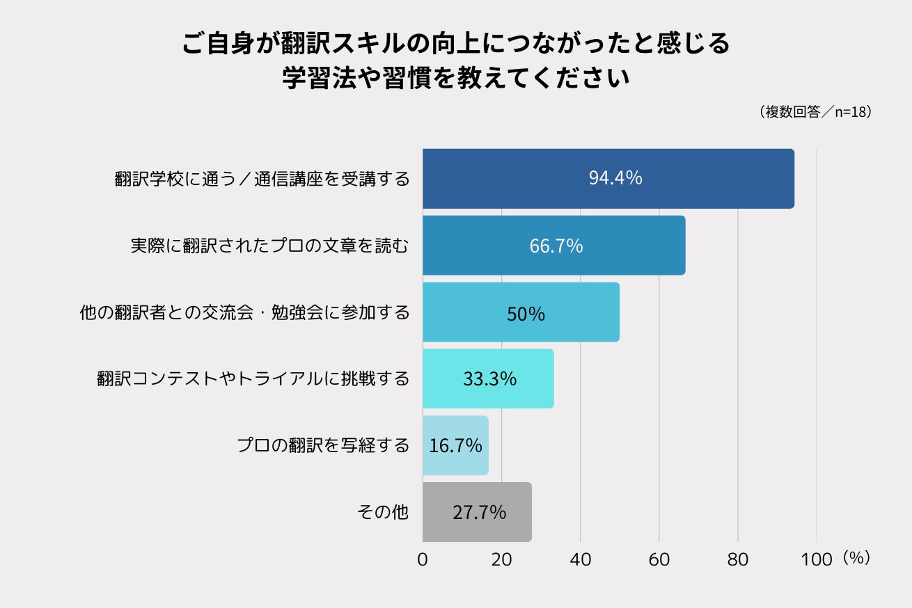 アンケートでは「翻訳スキルの向上に最も役立った学習法・習慣は?」という設問に対して、複数回答形式で自由に選択してもらいました。その結果、翻訳学校での学習(94%)が最も多く挙げられ、続いてプロの文章を読む(67%)、翻訳者同士の交流(50%)がランクインしました。