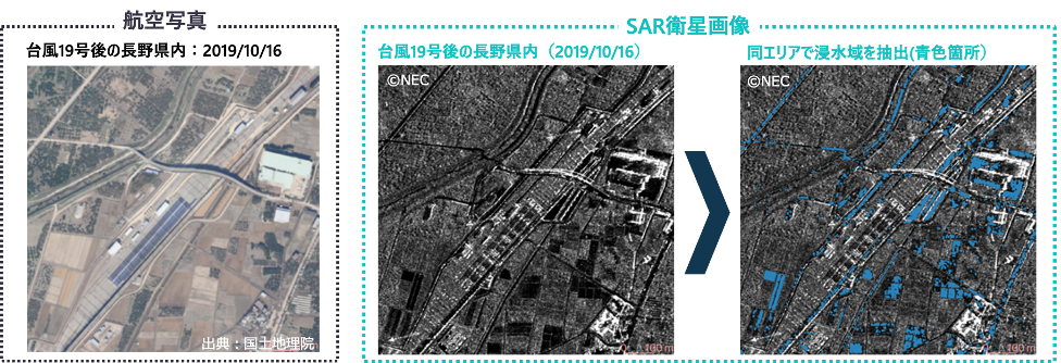 (※)合成開口レーダー(SAR: Synthetic Aperature Redar)衛星:衛星自ら地上の対象物に対して電波を照射し、対象物からの反射情報から地表面を観測する。モノクロ画像であるため視認性は低いものの、曇天時や夜間でも観測可能であり、対象物の構造や材質等を特定できるという特徴がある。