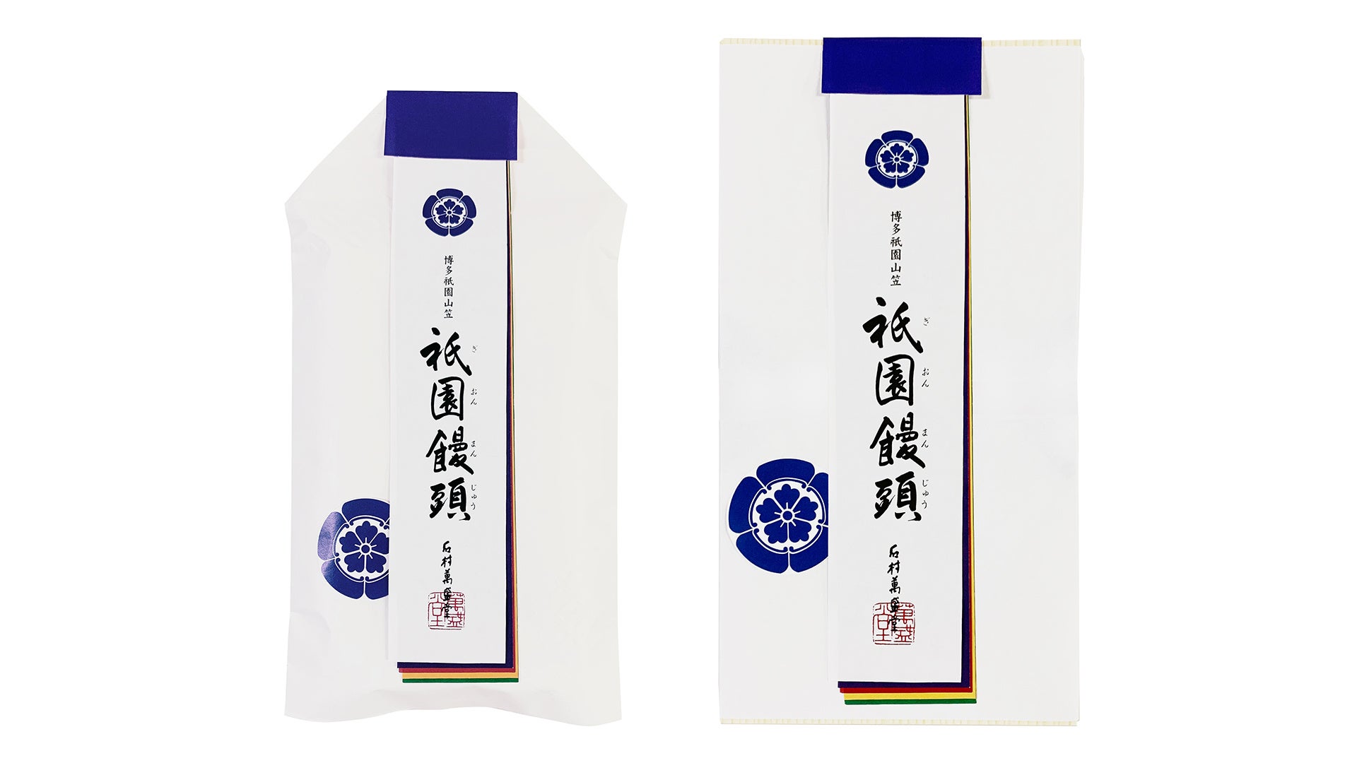 毎年、山笠の季節になりますと、博多の家々では「祇園饅頭」をいただき、山笠期間中の悪事災難を祓う習慣がございます。博多総鎮守「櫛田神社」祇園宮の御神紋を付したこの「祇園饅頭」は、博多祇園山笠には欠かせない縁起菓子として、また、暑気払いの夏越(なごし)饅頭として、今なお博多っ子に親しまれております。御神紋を食べぬよう商品には焼印せず、個包装のみに印を入れております。真っ白で清らかな包装には、縁起の良い五色の短冊をお付けしました。