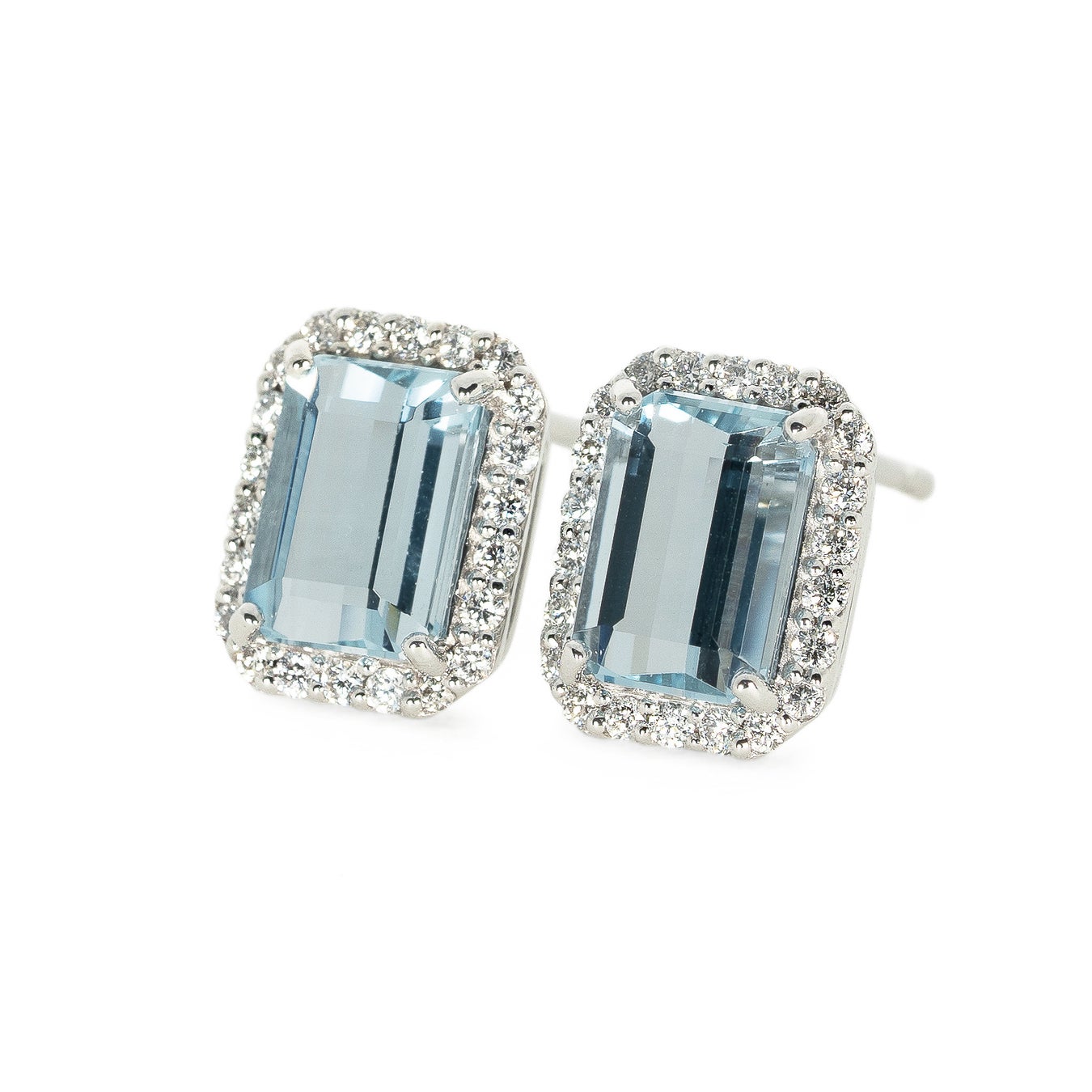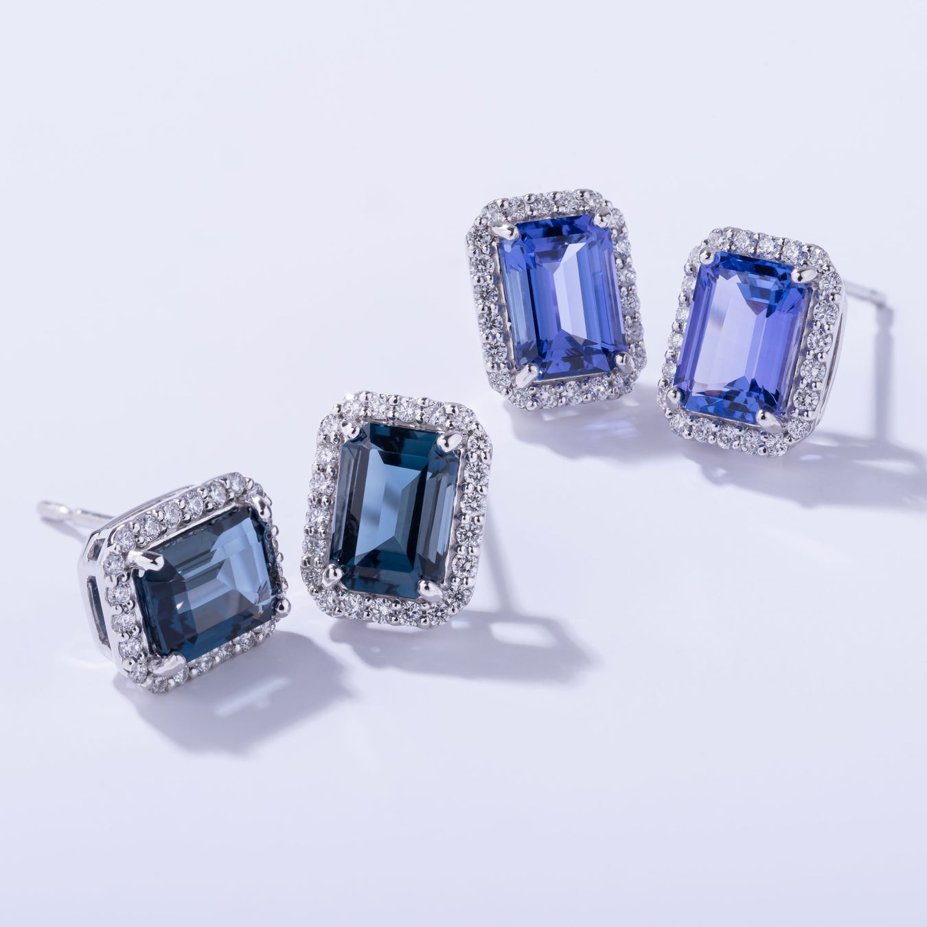 画像)左よりロンドンブルートパーズピアス ¥198,000~(PT900,ブルートパーズ計2.17ct ダイヤモンド計0.2ct) 、タンザナイトピアス ¥330,000~(PT900, タンザナイト計2.16ct ダイヤモンド0.2ct)
