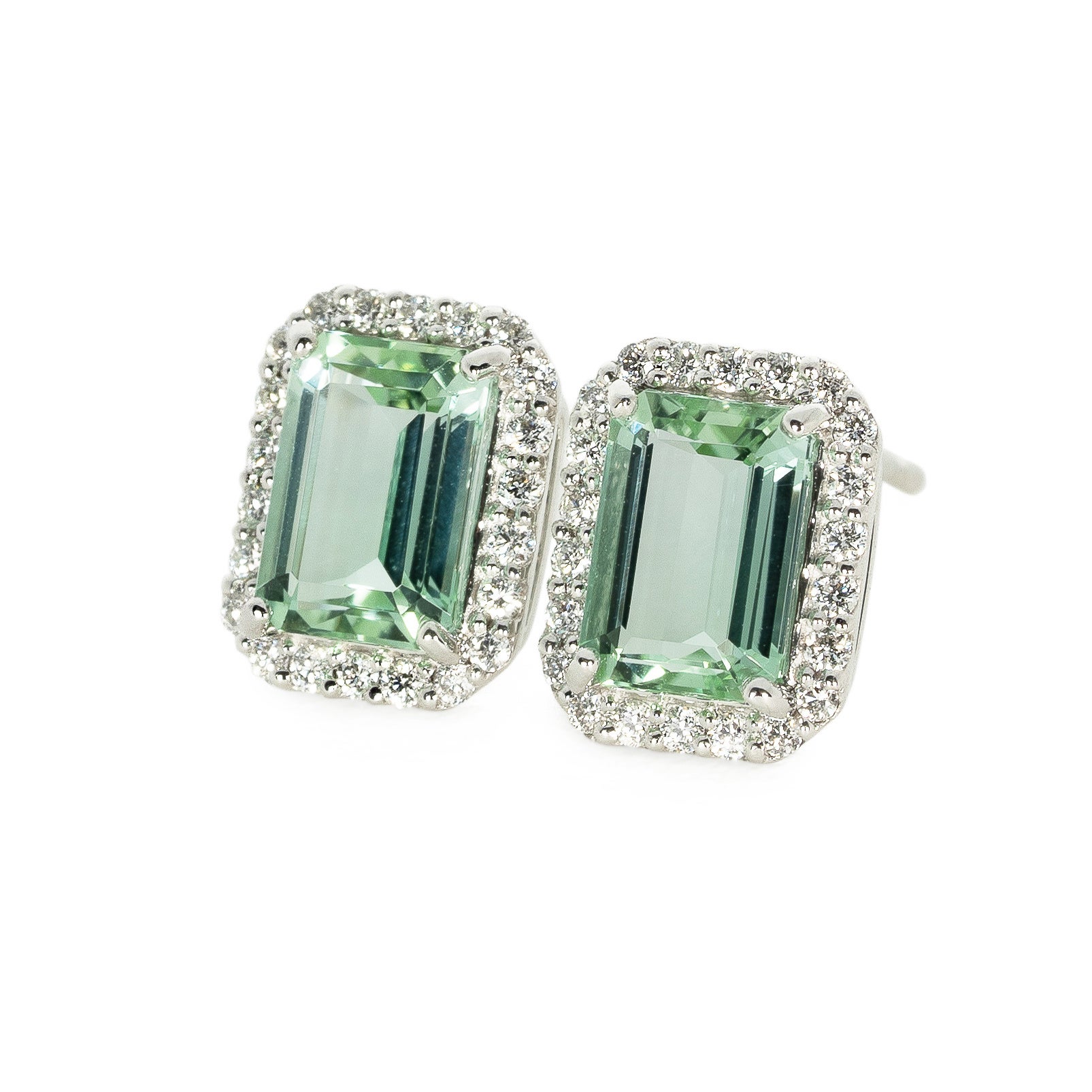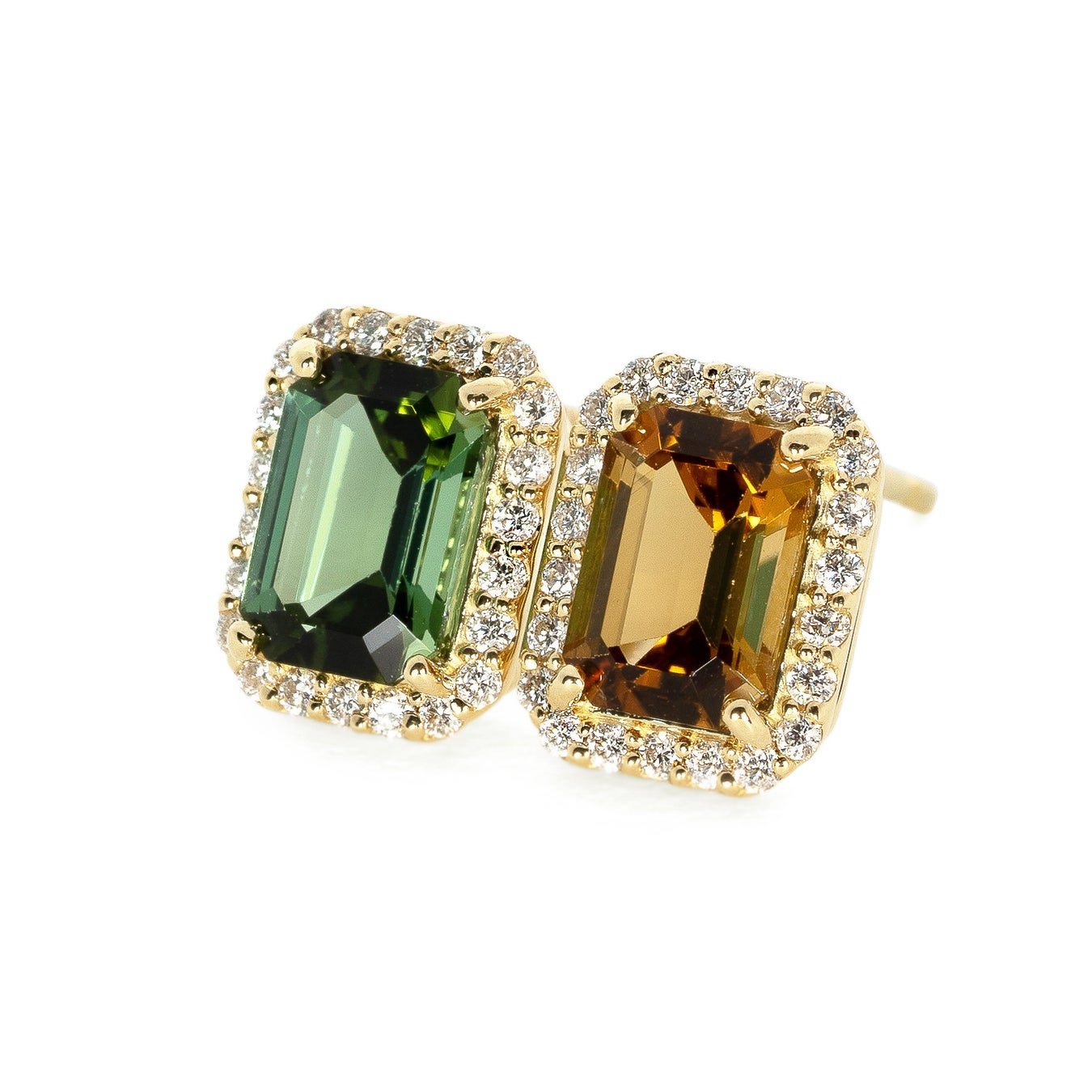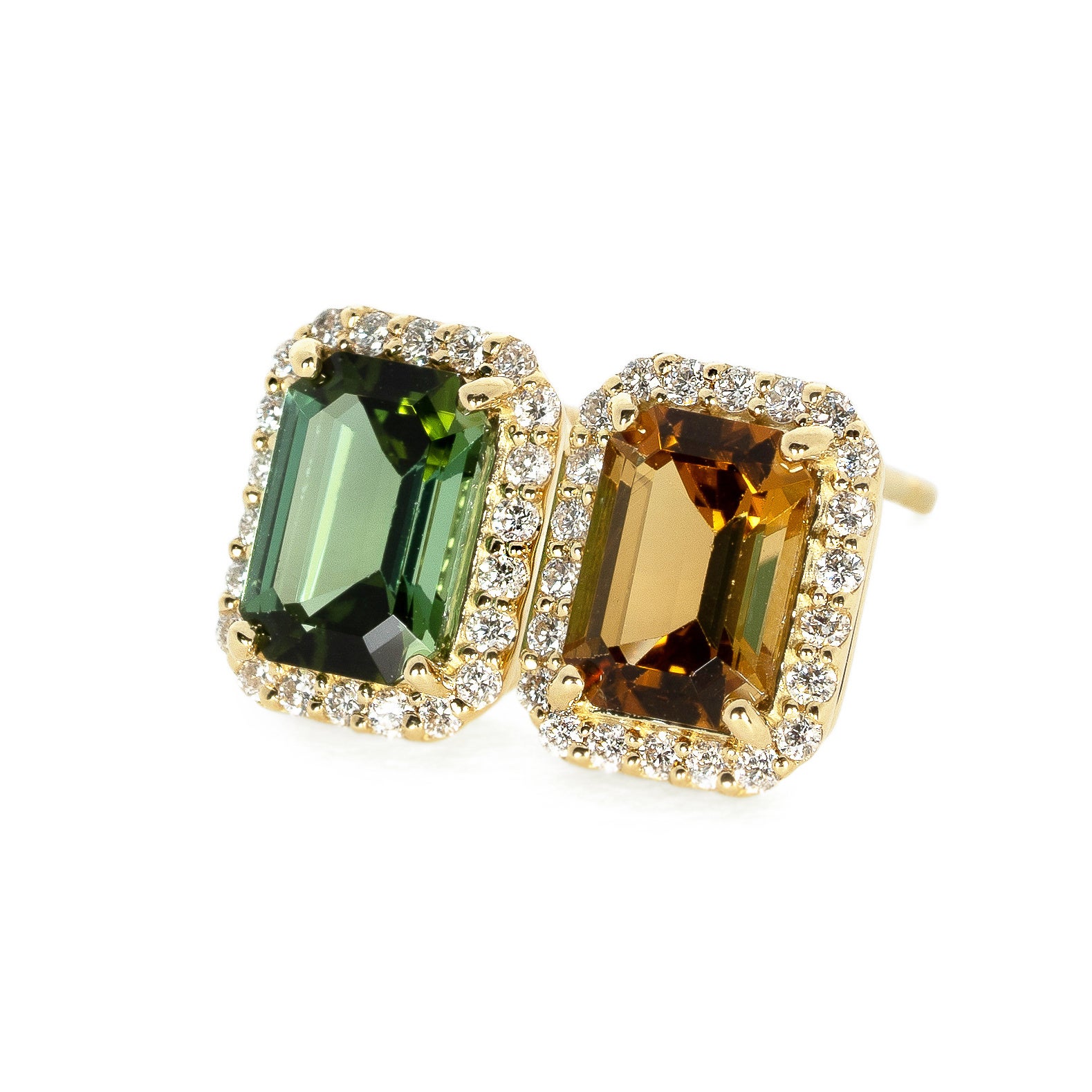 これらのピアスは、大ぶりなカラーストーンが中心となっており、顔の周りに華やかな印象をもたらします。さらに、取り巻くメレダイヤモンドがカラーストーンの色を一層際立たせ、上品な輝きを放ちます。
