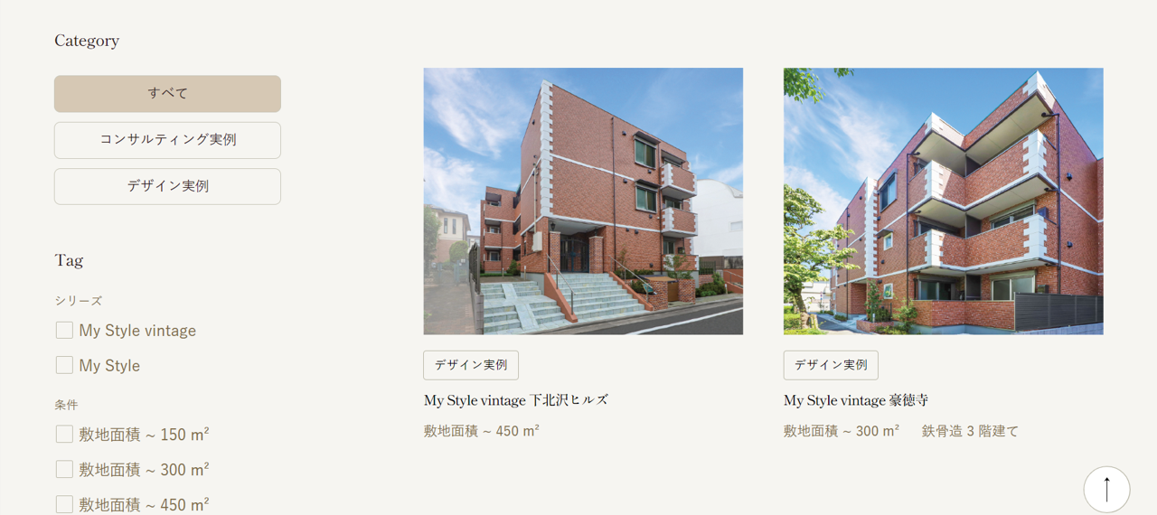 アパート建築や土地活用を含めたコンサルティングの「実例集」をいっそう充実させました。絞り込み機能を実装し、敷地面積や階数など見たい情報に合わせて検索することが可能に。