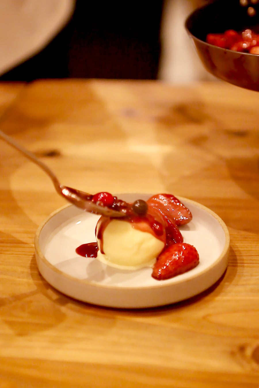 出来上がった熱々のソースはその場で冷たいバニラアイスにかけてお召し上がりいただきます。
