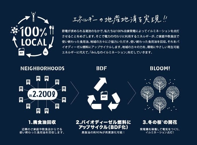 2010年の開始以降、地域のご家庭や飲食店のご協力により、大崎・五反田エリアの目黒川沿いに冬の桜®を咲かせてきた本イルミネーションは、使い終わった食用油をアップサイクルしエネルギーとして活用する「エネルギーの地産地消」を10年以上行い、地域のサーキュラーエコノミーを実現してきました。電力不足が叫ばれる昨今だからこそ、 “ひと・地域・企業”と自治体が一体となって「エネルギーの地産地消」を実現することの大切さや意義を広めていきたいと考えています。