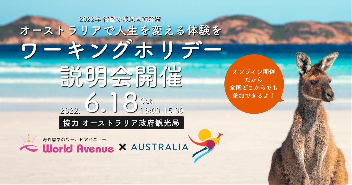 2022年6月18日(土) 13時-15時、オーストラリア政府観光局様 協力のもとワーキングホリデー説明会 第二弾を開催いたします。ご渡航直後のモニターの方にも登壇いただくことを予定いたしております。ワーキングホリデー制度を利用し海外生活を送る方からリアルなお話を聞いていただける貴重な機会を提供いたします。