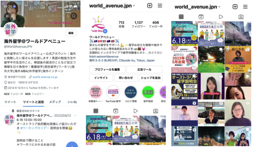 ワールドアベニュー公式SNSでは、オーストラリアを含む主要英語圏を中心とした留学・ワーキングホリデーに必要なビザ情報や語学学校のキャンペーン情報、渡航されたお客様よりご共有いただいた海外の生活情報など海外に挑戦したいと考えている方に役立つ情報を配信しています。