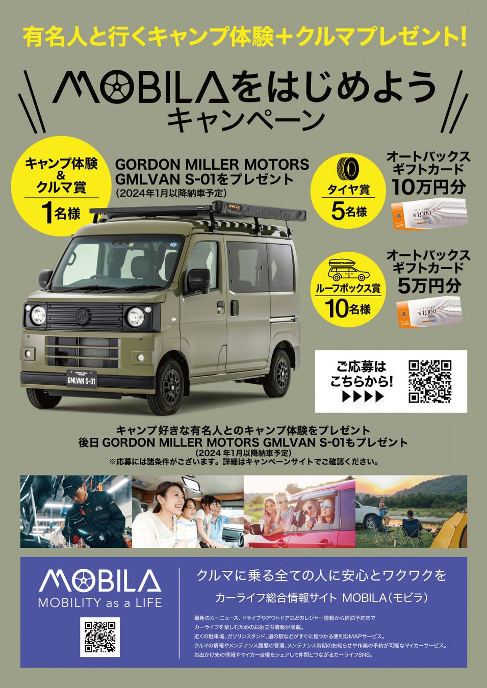 MOBILAに会員登録すると、抽選でキャンプ好きな有名人とのキャンプ体験&GORDON MILLER MOTORS GMLVAN S-01やオートバックスのギフトカードが当たります。