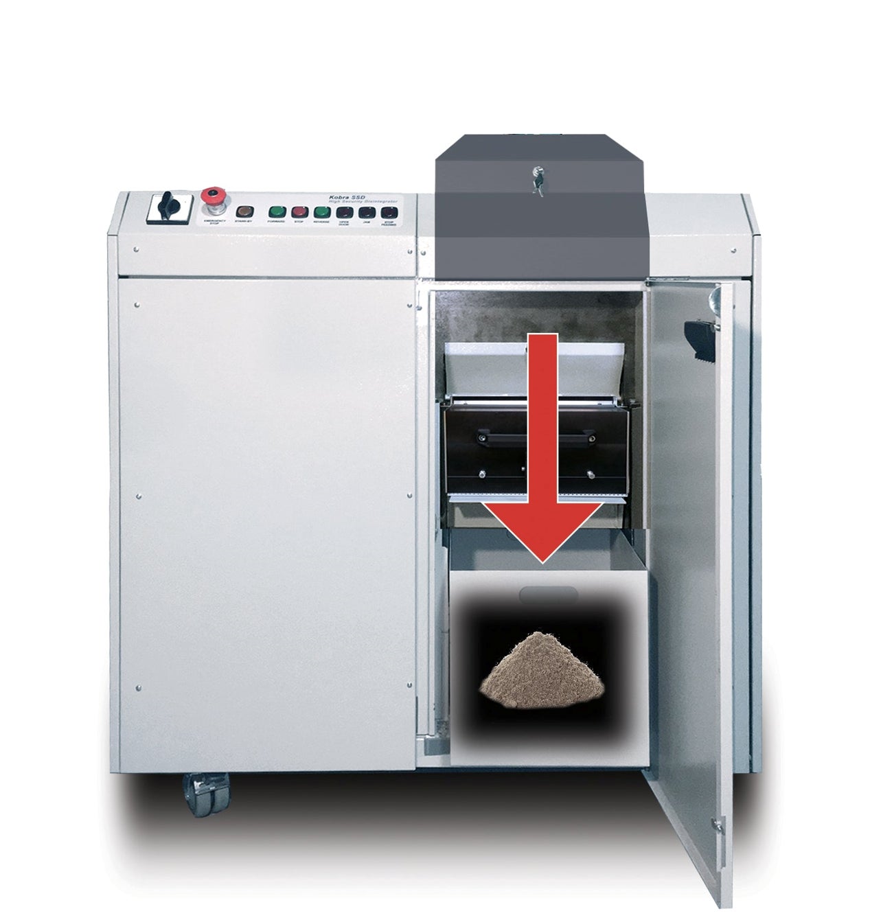 Kobra SSDでは、独自の二段階破砕システム採用により、NSAで要求されているSSDやUSBメモリ、基盤等の破壊サイズである“2mm角以下”まで粉砕することができます。またブラシ付き投入ポートにより、投入口の安全性を確保、特殊HEPAフィルターシステムにより清潔で快適な作業環境を確保できます。