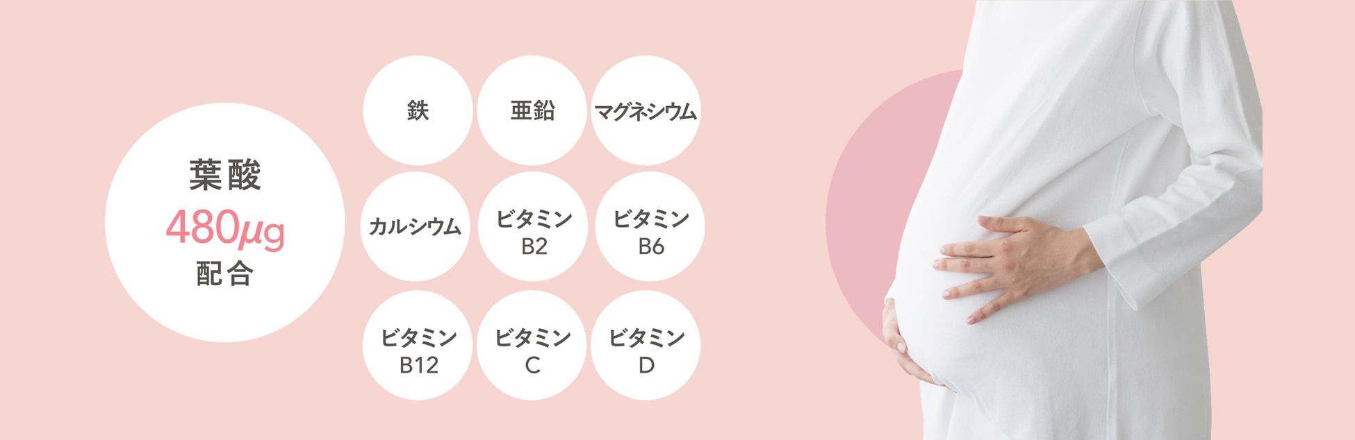 妊娠中期〜授乳期に必要な9成分と「葉酸480μg」を配合。