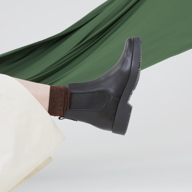 昨年リニューアルしたサイドゴアブーツです。両サイドのゴムが程よく伸縮するので、脱ぎ履きのしやすさが抜群。重厚感のあるソールにはXL EXTRALIGHT®を採用することで、柔軟性・衝撃吸収性がアップし、軽い履き心地を叶えました。スムースレザーはスコッチガード™加工されており、機能が充実した一足です。