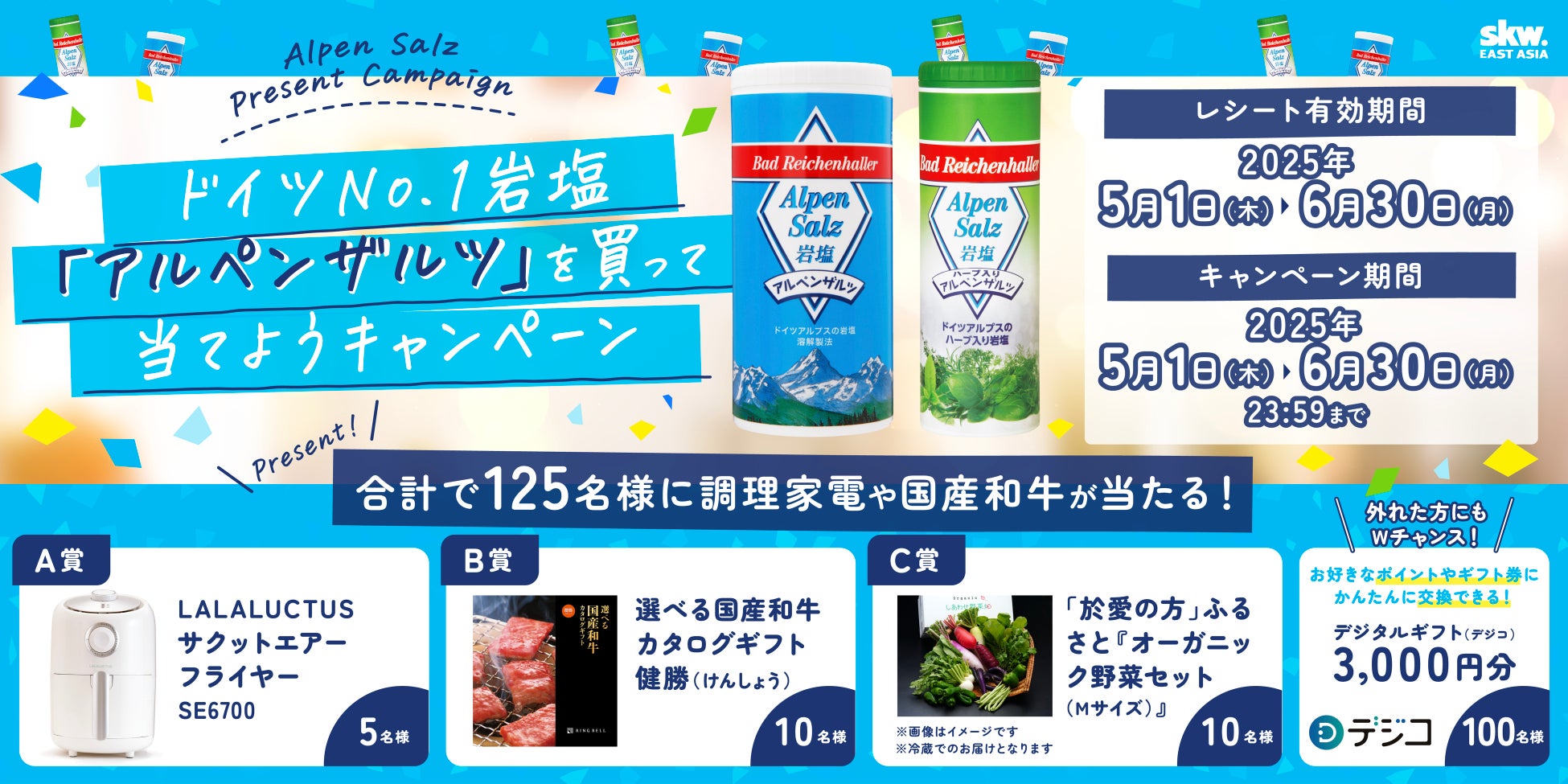 ドイツアルプスの岩塩「アルペンザルツ」を輸入販売するSKWイーストアジア株式会社(本社:東京都千代田区、代表取締役社長:生澤 靖明) は、『ドイツNo.1岩塩「アルペンザルツ」を買って当てようキャンペーン』を5月1日(木)~6月30日(月)まで実施します。