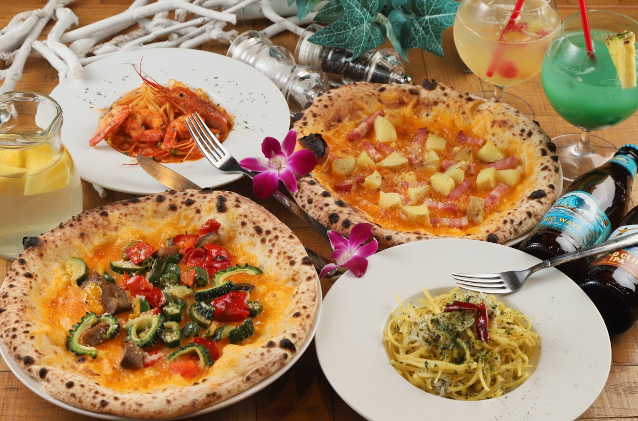 「釜焼きピザ」、「生パスタ」、「ガーリックシュリンプ 」など本格的なオリジナルメニュー