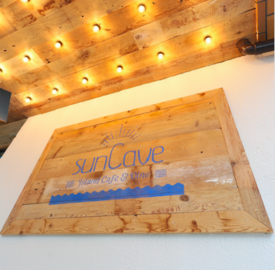 ■今回のグランドオープンに際し、当店は久米島をはじめとする新鮮な島野菜や食材を使用し、ハワイや沖縄の海辺でリラックスできるようなカフェレストランをコンセプトした。店舗内装デザインは、クライアント様から造作で残っていた岩塗装を活用したいと依頼を受け、「海辺の洞窟のような演出にしたい」というアイディアをもとに打ち合わせを重ね、「sunCave (太陽と洞窟)」という海辺の洞窟から溢れる太陽をイメージした店内になっている。