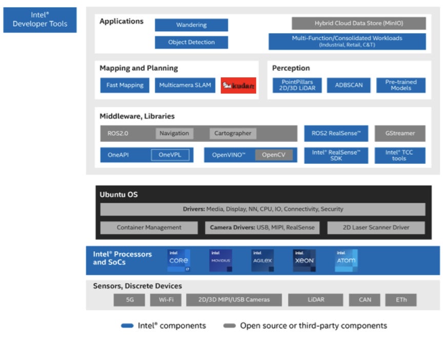 IntelのAMRプラットフォーム向けエッジ・インサイトは、オープンかつモジュール式のソフトウェア開発キット(SDK)です。ライブラリ、ミドルウェア、サンプル・アプリケーションを兼ね備えており、顧客のアプリケーションのニーズに最も適したあらゆるコンピュートアーキテクチャ(例:XPUなど)に対応可能なAMRハードウェア及びソフトウェア・ソリューションの開発と導入の加速が期待できます。本SDKは、コードを一度実装すれば、複数のハードウェア構成に展開できるため、開発期間の短縮に貢献します。そのなかで、SLAMは、機械に空間認識機能を提供し、「マッピングとプランニング」機能において重要な役割を果たしています。Intelの戦略的技術パートナーとして、KudanのKdVisualは、様々な環境と多岐にわたる用途に対応するロバスト性、柔軟性、性能を備えた商用グレードのSLAMを必要とするプロジェクトを対象に、本SDKに採用されています。