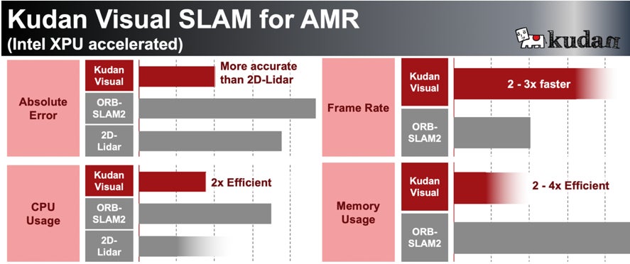 AMRプラットフォーム向けエッジ・インサイトの一部としてKdVisualが提供されることは、IntelとKudanの継続的な協力関係の集大成といえます。この2年間の共同開発を通じて、IntelのXPU(第11世代Intel Coreもしくは第 3 世代Intel Xeon スケーラブル・プロセッサ以降のプロセッサ)でKudanのSLAMアルゴリズムのハードウェアアクセラレーションによる最適化を行ったことで、KdVisualの性能の強化が実現しており、速度・精度・信頼性においてKudanの圧倒的なSLAM性能の更なる向上を実現しています。