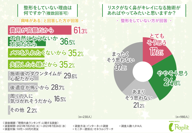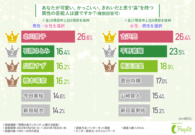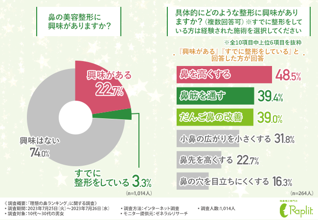 そこで今回、『隆鼻(りゅうび)矯正専門店ラプリ』(https://raplit.com/)を運営する株式会社ラプリは、10代~30代の男女を対象に、「理想の鼻ランキング」に関する調査を実施しました。