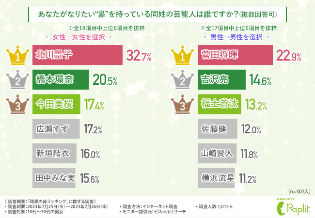 女性には自分がなりたい鼻を持つ女性芸能人を、男性には男性芸能人を選んでいただきました。