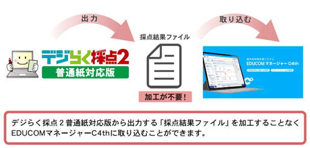 「EDUCOMマネージャーC4th(以下、C4th)」は、EDUCOMがクラウドあるいはオンプレミスで提供する、全国の小中学校向けに先生の校務の効率化を支援する統合型校務支援システムです。全国、約500自治体、約10,000の小中学校で利用されておりトップシェアを誇ります。今回の「デジらく採点2普通紙対応版」との連携により、「デジらく採点2普通紙対応版」から出力したデータを加工することなくそのまま「C4th」に取り込むことが可能になりました。これにより教員によるデータ加工時間の削減や、成績処理時のミスをなくすことが期待できます。また、今後は「デジらく採点2クラウド」との連携も予定しています。