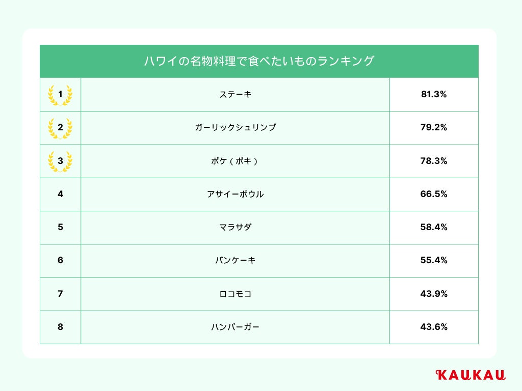■ハワイで食べたい名物料理、1位ステーキ、2位ガーリックシュリンプ、3位ポケ。