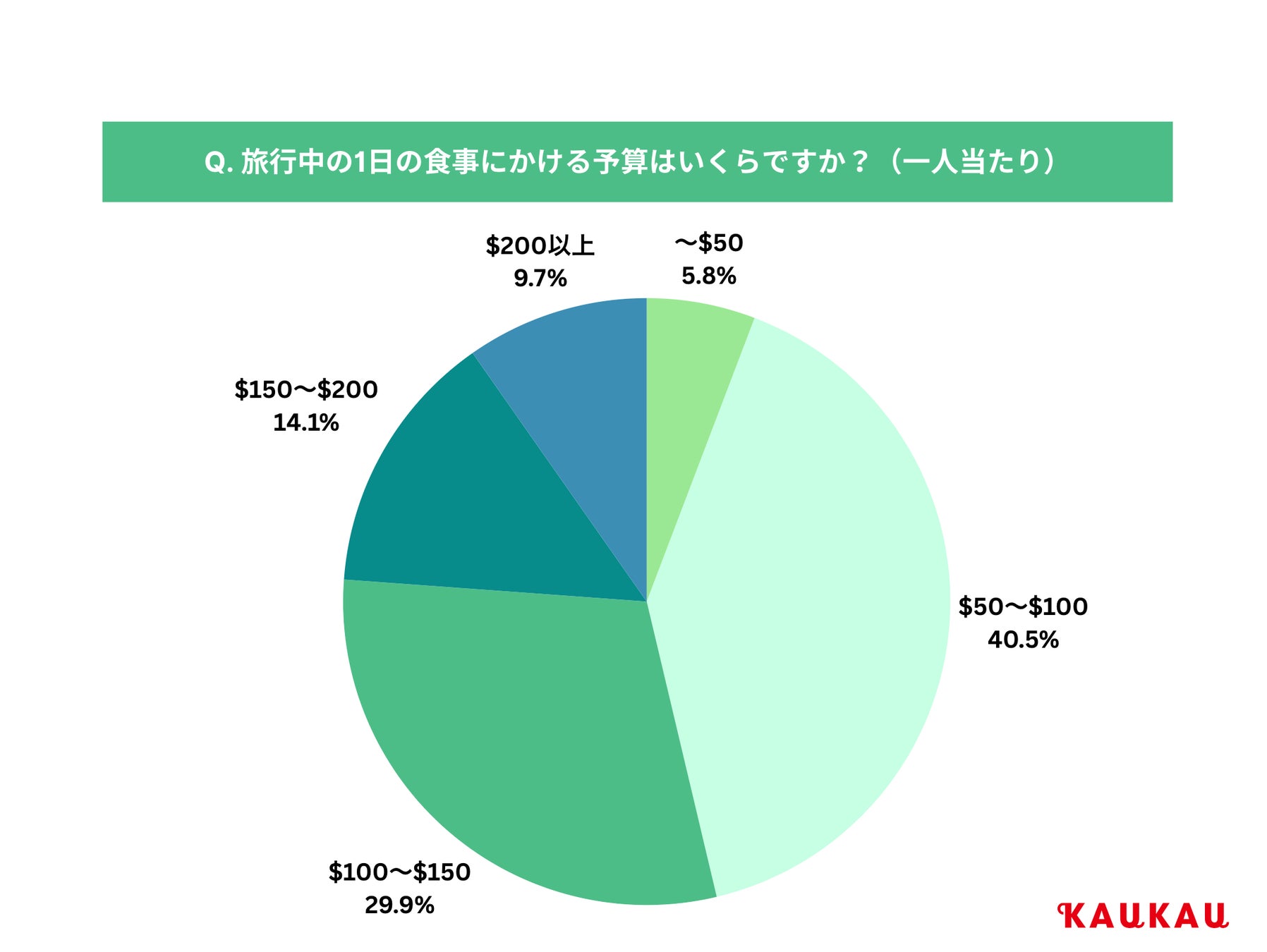「旅行中の1日の食事にかける予算はいくらですか?(一人当たり)」という質問では、$50〜$100が40.5%(単一回答)で一番多く、次いで$100〜$150が29.9%、$150〜$200が14.1%、$200以上が9.7%、$50以下が一番少なく5.8%となりました。$100以上と回答した人は全体の53.7%にあたり、半数以上の人がハワイ旅行中の1日の食事に$100(約14,746円/2024年1月30日時点)以上を使うという結果になりました。ハワイでは円安や物価高騰の状況もあり、旅行者の予算の意識が変化しているように思われます。