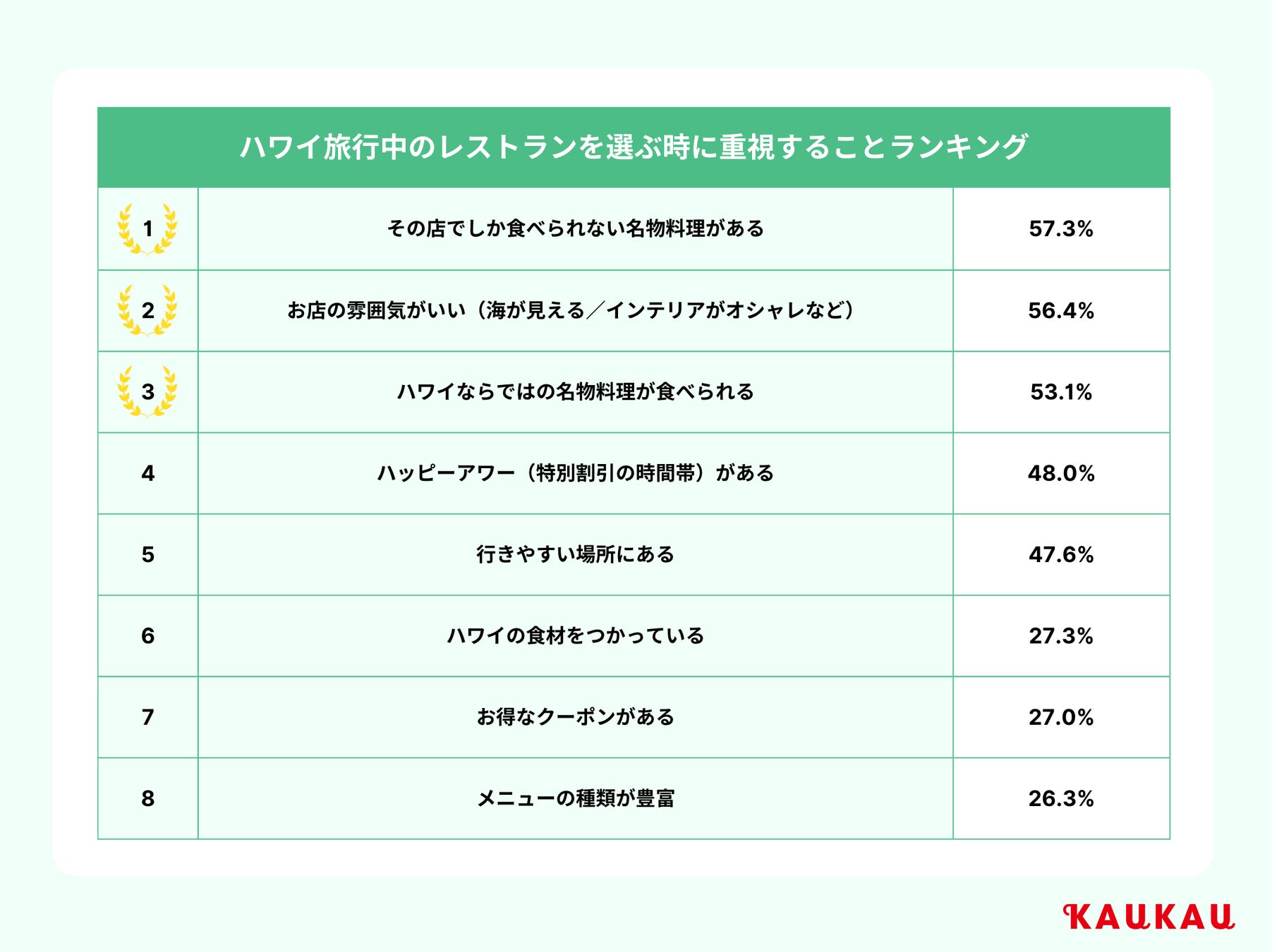 「旅行中のレストランを選ぶ時に重視することはなんですか?」の質問には、「その店でしか食べられない名物料理がある」と回答した人が57.3%(複数回答)で1位に選ばれました。「ハワイならではの名物料理が食べられる」という回答も53.1%となり、半数以上の人がハワイ旅行中のレストランを選ぶ決め手として、その店ならでは、またはハワイならではの看板メニューを求めていることがわかりました。また「お店の雰囲気がいい(海が見える/インテリアがオシャレなど)も56.4%で、お店のロケーションやイメージも大切な要素といえそうです。また「ハッピーアワーがある」「お得なクーポンがある」も高い回答率となり、円安や物価高騰の中でも、できるだけお得に楽しみたいという気持ちも伺えます。