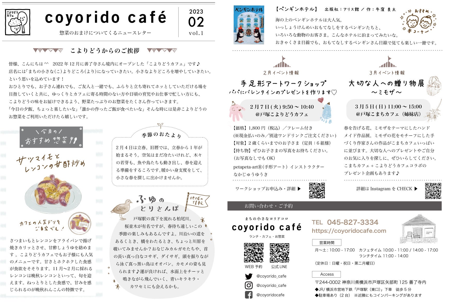 神奈川県横浜市戸塚区にあるカフェ型居場所「こまちカフェ」を運営する認定NPO法人こまちぷらすが、2022年12月に法人として2店舗目となるカフェ「こよりどうカフェ」を400年の歴史を持つお寺の境内にオープン。カフェという居場所の運営と共に、働きながら子育てをしている世帯の応援と地域とのつながりづくりをきっかけとして、お惣菜を届ける事業を4月より開始いたします。