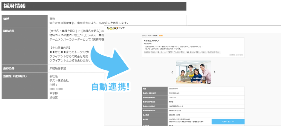 当社のホームページシステム利用者は、自社サイトに求人ページを作成するだけで「GOGOジョブ」へ自動掲載。求人媒体ごとにログインして求人票を掲載する手間を排除しました。別途の登録・申請は不要です。