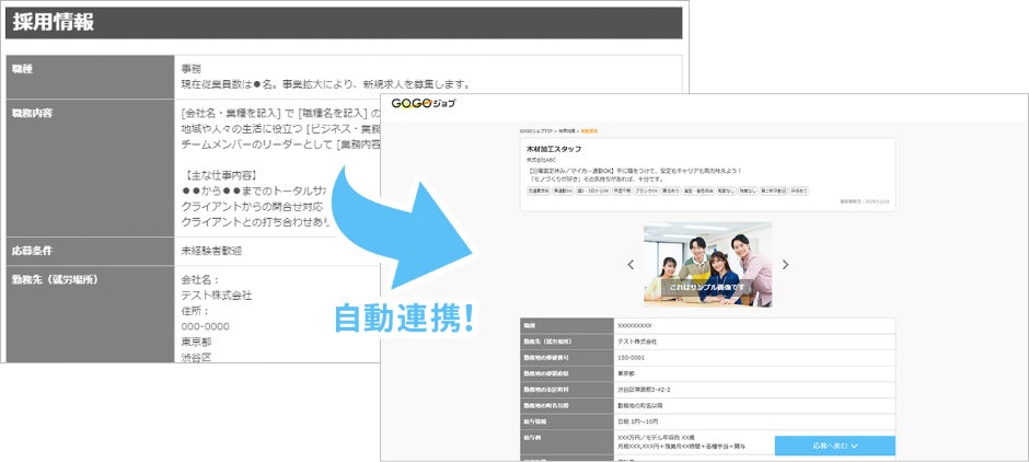 加えて、自社ホームページと求人情報をリアルタイムで自動連携し、採用活動の運用代行までを行う付帯サービス「GOGOジョブPLUS」も同時に提供開始することをお知らせいたします。