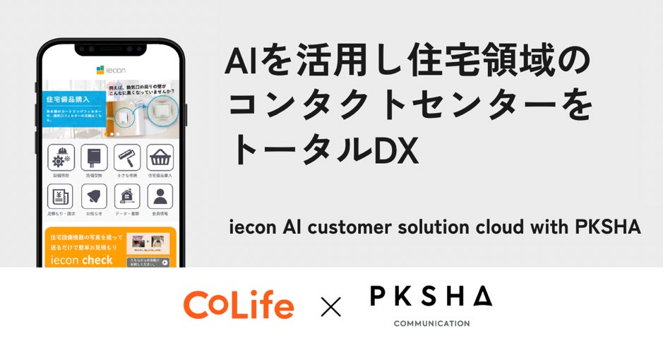今回のソリューション導入により、まずはCoLifeにおけるオペレーター業務の負荷軽減・コンタクトセンター業務の標準化・顧客体験の向上を目指し、最適化されたソリューションの構築後、業界全体への展開に着手します。業界に最適化したAIコンタクトセンターを形にするにあたり、具体的には、住宅業界特有の用語や表現、品番やメーカー等特定の情報が多量に必要とされるため、ieconデータベースとAI SaaSとの連携に加え、「PKSHA Speech Insight」での音声認識用の住宅業界のキーワード登録や、AI音声対話システムにおける対応業務にあわせた対話フローの構築を行います。ieconデータベースと連携したAIによる住宅業界コンタクトセンター最適化ソリューションを「iecon AI customer solution cloud with PKSHA」として、今後住宅業界のコンタクトセンター向けに共同での販売・提供を進め、「iecon」アプリ及びデータベースと合わせ、住宅業界のDXを実現し、日本の住宅における顧客体験向上を目指します。PKSHAは、今回のCoLifeとの取組みを通じ、人とソフトウエアがスムーズに相互連携する世界の実現と、未来の顧客体験の実現に向け支援して参ります。