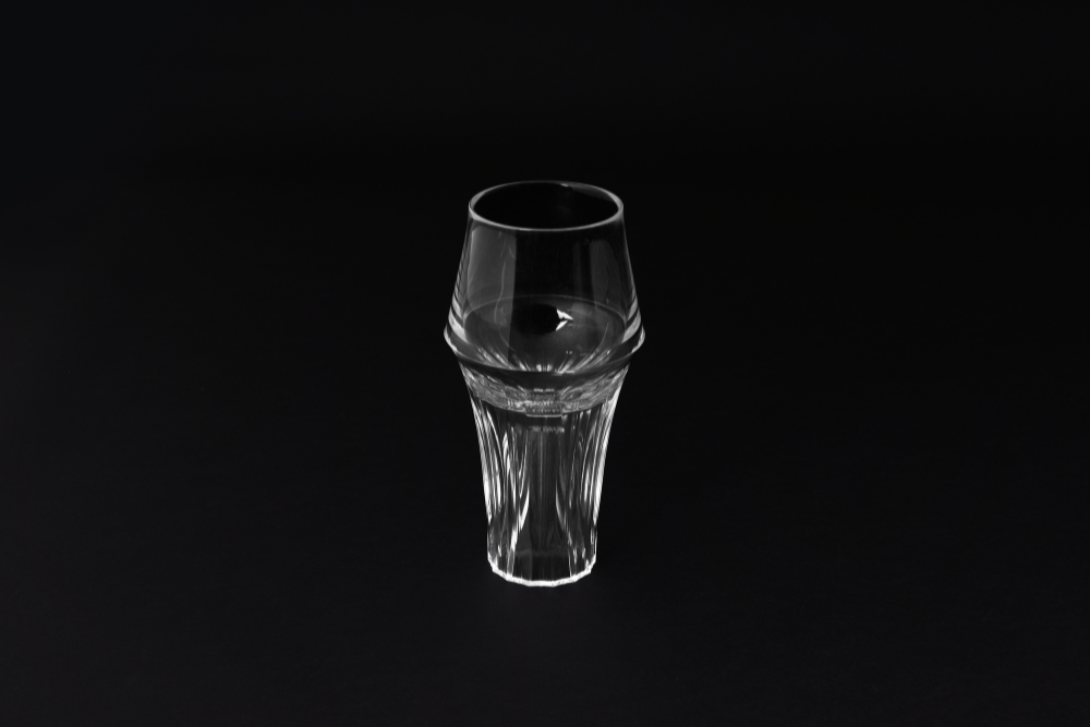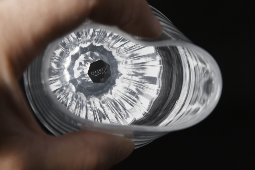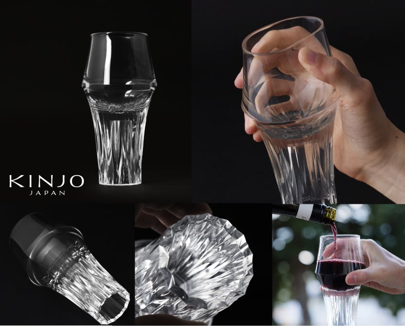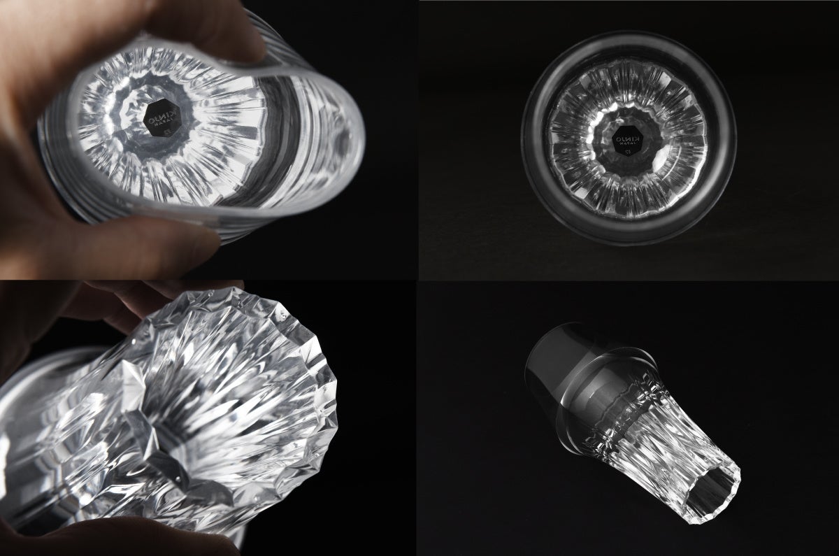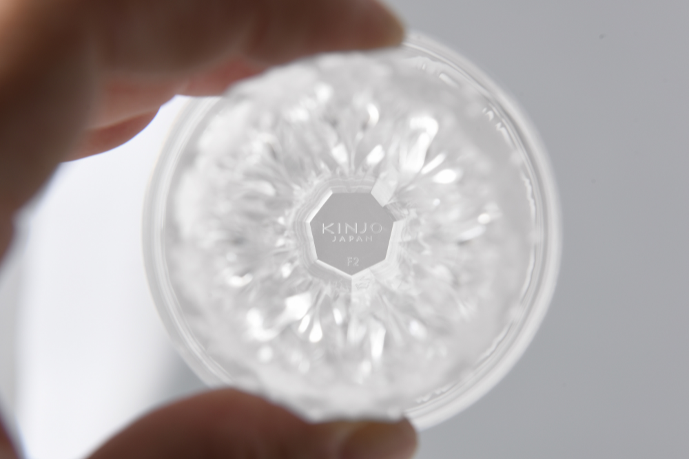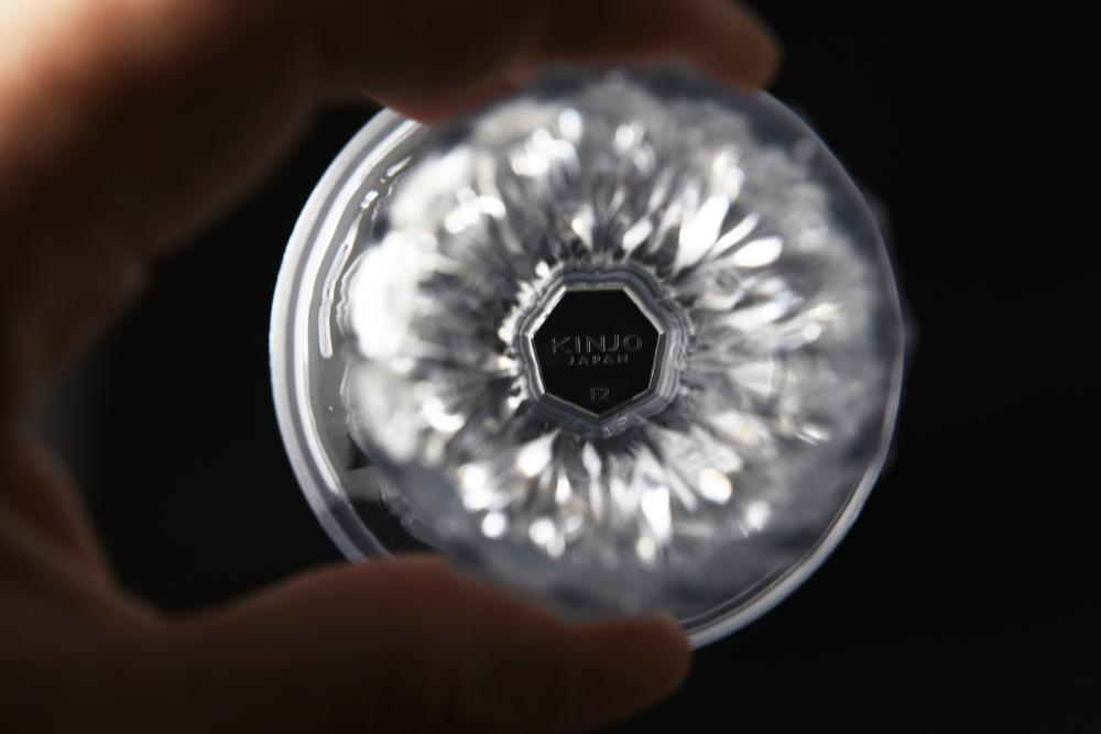KINJO JAPAN F2のポイントは、脚付きグラスの代名詞ともいえるステム部分を大胆にアレンジした点にある。希少なシリコーンゴムを存分に使い、手で包み込みたくなる絶妙なフィット感と、切子をイメージしたシャープなカッティングデザインを実現した。また、底面の空洞部分にも同デザインを施すことで、万華鏡のような輝きをお楽しみいただける。そしてカップ部分は、香りのある飲み物をお楽しみいただけるようボウルの丸みを強調。味わいの決め手となるリム部分は、厚みと質感にこだわり、滑らかな口当たりを実現させた。
