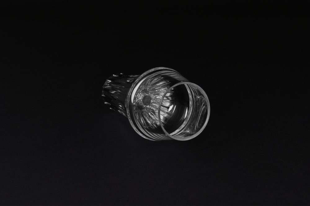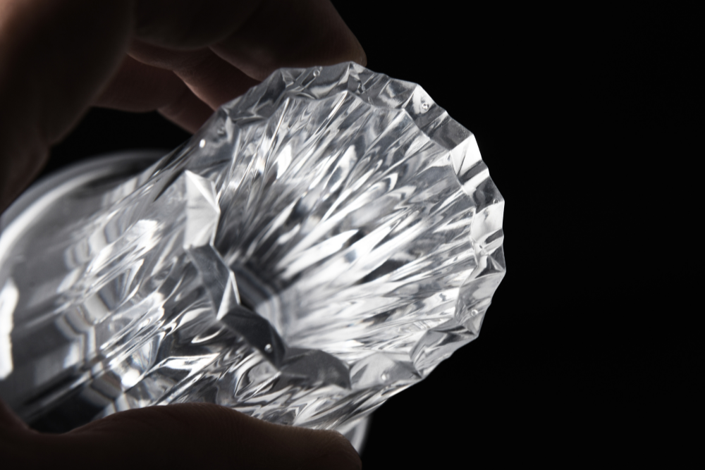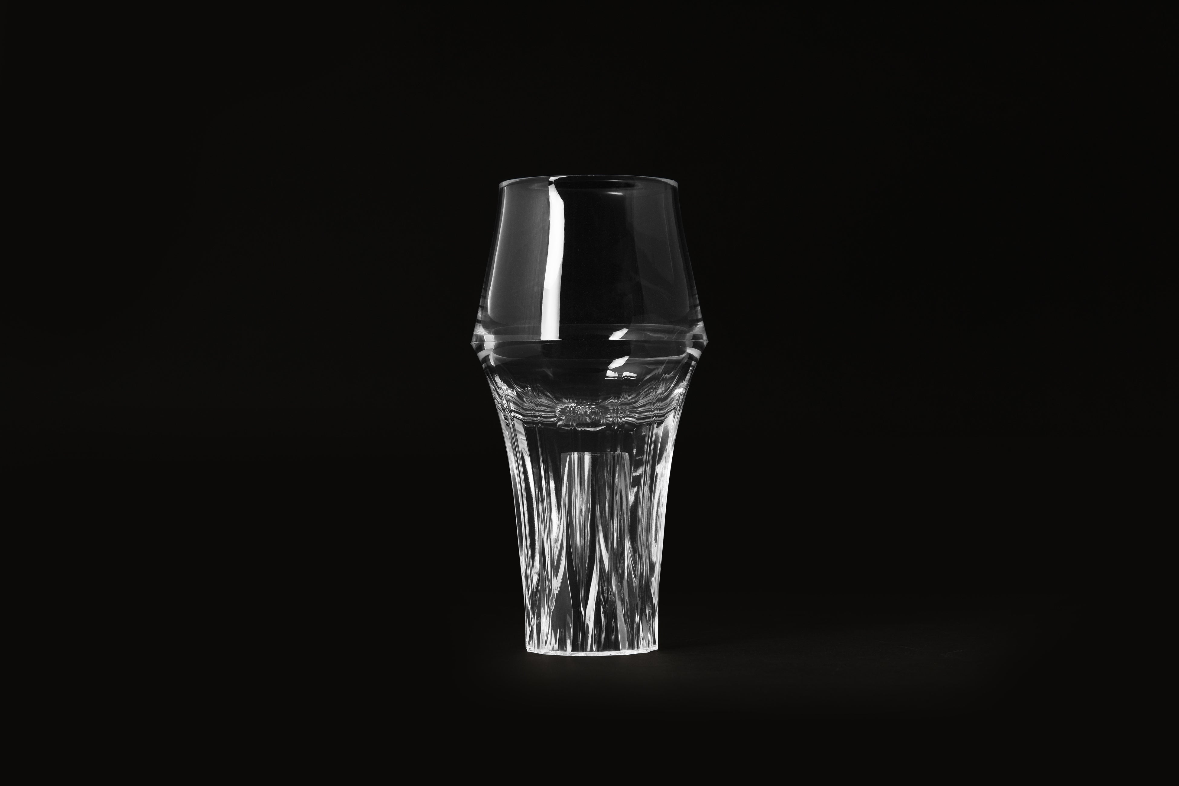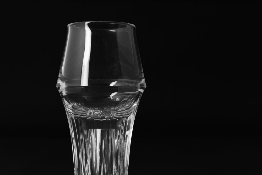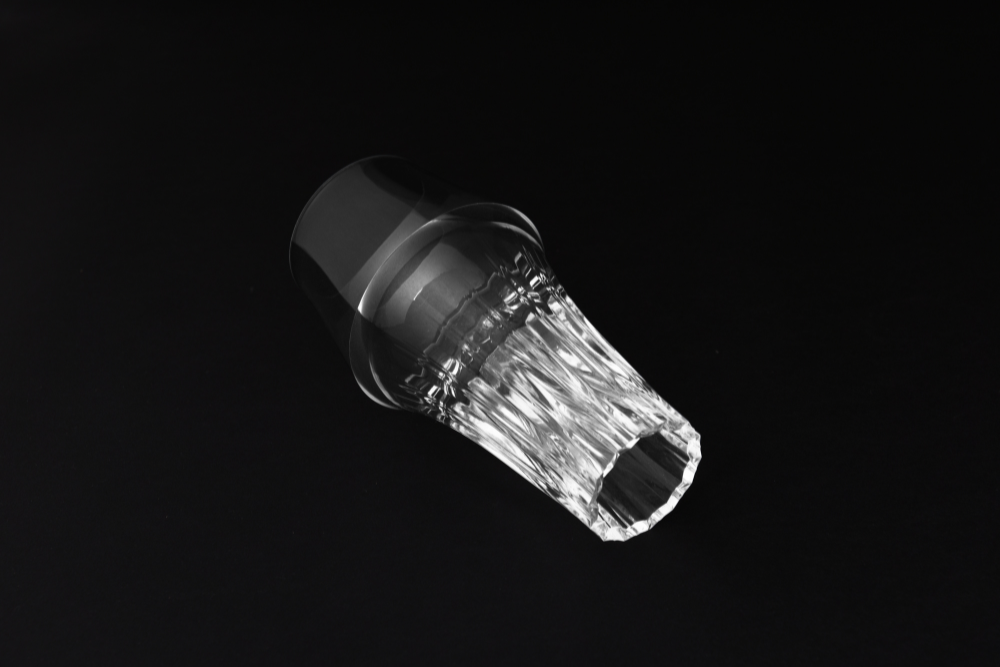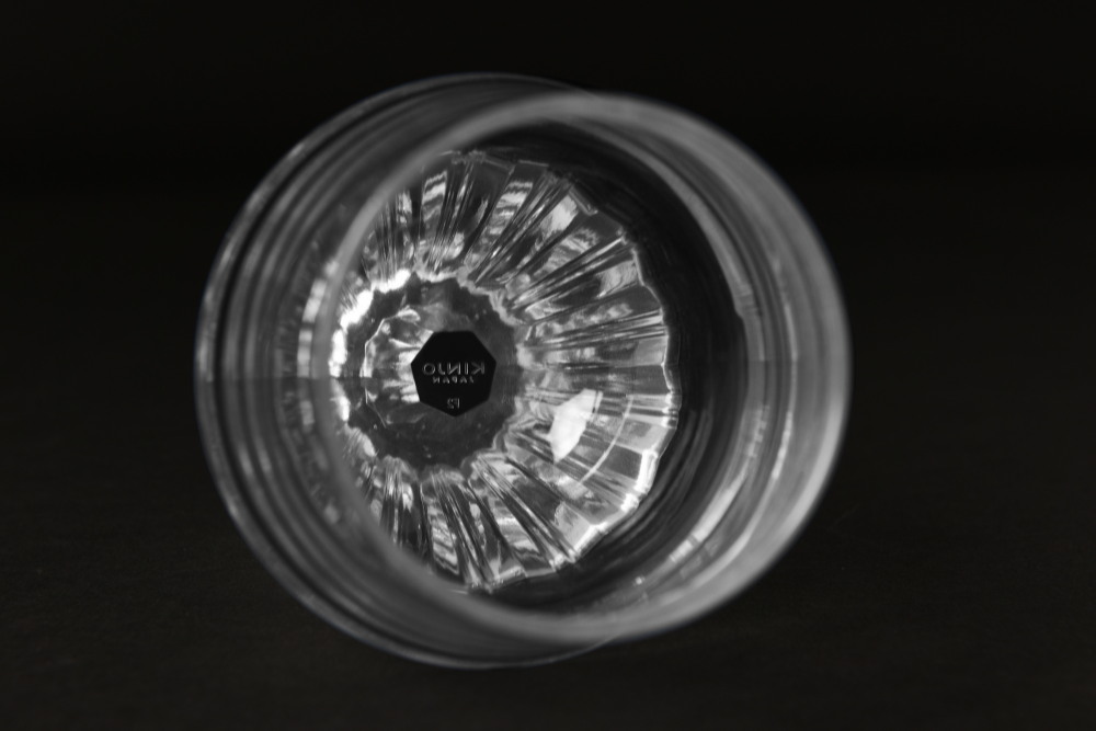 KINJO JAPAN F2のポイントは、脚付きグラスの代名詞ともいえるステム部分を大胆にアレンジした点にある。希少なシリコーンゴムを存分に使い、手で包み込みたくなる絶妙なフィット感と、切子をイメージしたシャープなカッティングデザインを実現した。また、底面の空洞部分にも同デザインを施すことで、万華鏡のような輝きをお楽しみいただける。そしてカップ部分は、香りのある飲み物をお楽しみいただけるようボウルの丸みを強調。味わいの決め手となるリム部分は、厚みと質感にこだわり、滑らかな口当たりを実現させた。