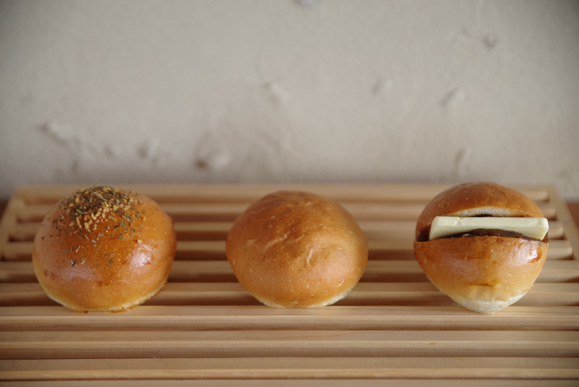 国産小麦100%、無添加、天然酵母で素材の味を存分に活かしたシンプルなまるぱん。サンライズソルトの揚げ浜製法塩が隠し味です。種類はカレーパン・豆パン・あんバターパン。今後は土曜日のみの販売となりますがグランドオープン日には特別に提供します。