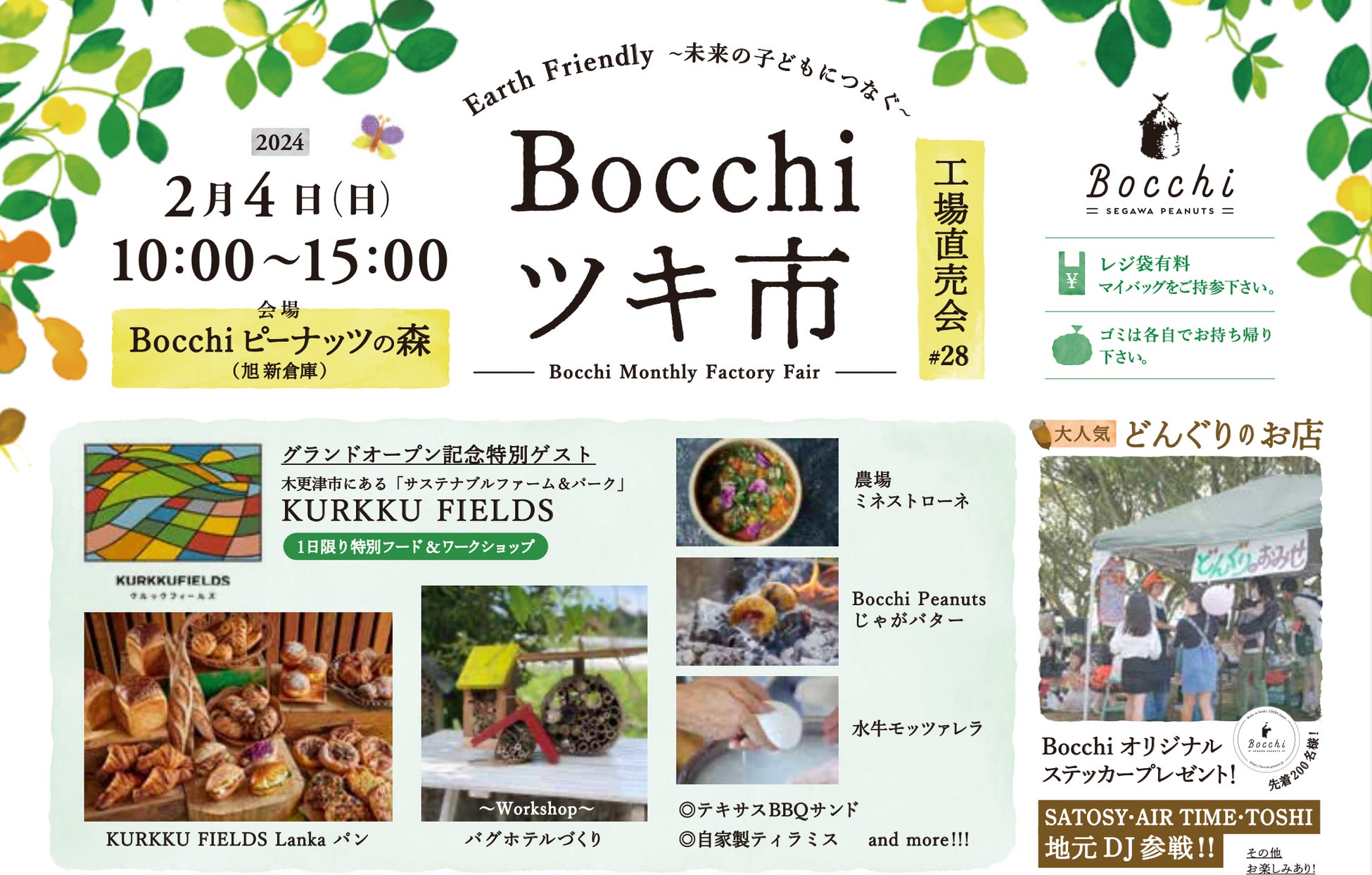 当日は、2022年から開催している『Bocchi ツキ市』も同時開催いたします。(今年から年4回の開催になります。)お子様はもちろん、老若男女が楽しめる「ピーナッツ福まき」は11:00〜/14:00〜の2回実施予定。様々な取り組みをされる出展者約25のブランドが千葉県内外より集まります。直接交流し、背景にあるストーリーを聞きながら買い物できるチャンスでもあります。すべての出展者については、別途チラシをご参照ください。