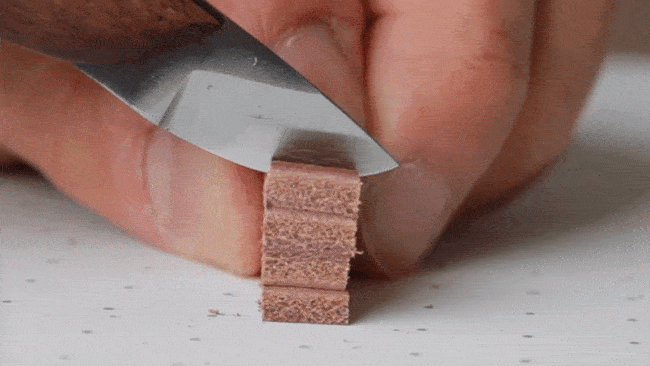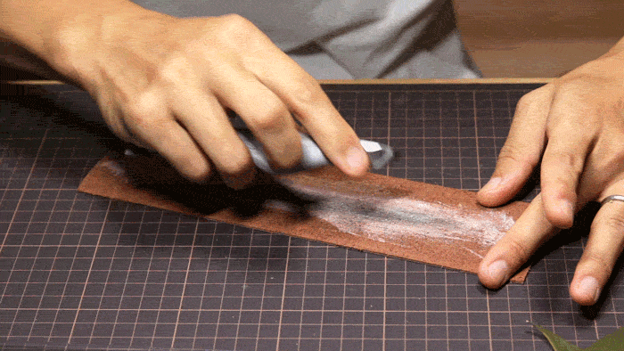 青紙二号が職人に愛されるもう一つの理由。それは研ぎやすさという点にもあります。革の裏面に市販の金属研磨剤をとり、刃の表を数回なでるように研磨するだけで切れ味が復活します。作業の合間に定期的にこの研磨をしていただくと、長く切れ味を維持することができます。