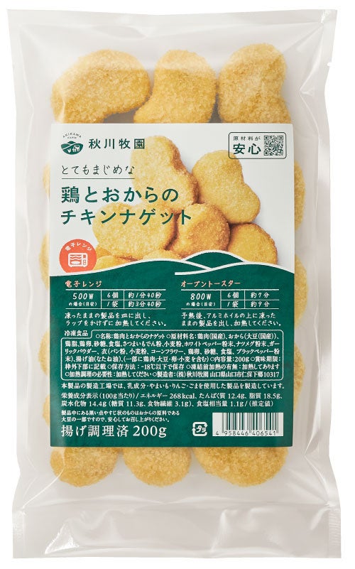 株式会社秋川牧園(山口市仁保下郷10317)は、サステナブルを意識した新商品「鶏とおからのチキンナゲット」を2023年3月27日に発売開始いたしました。