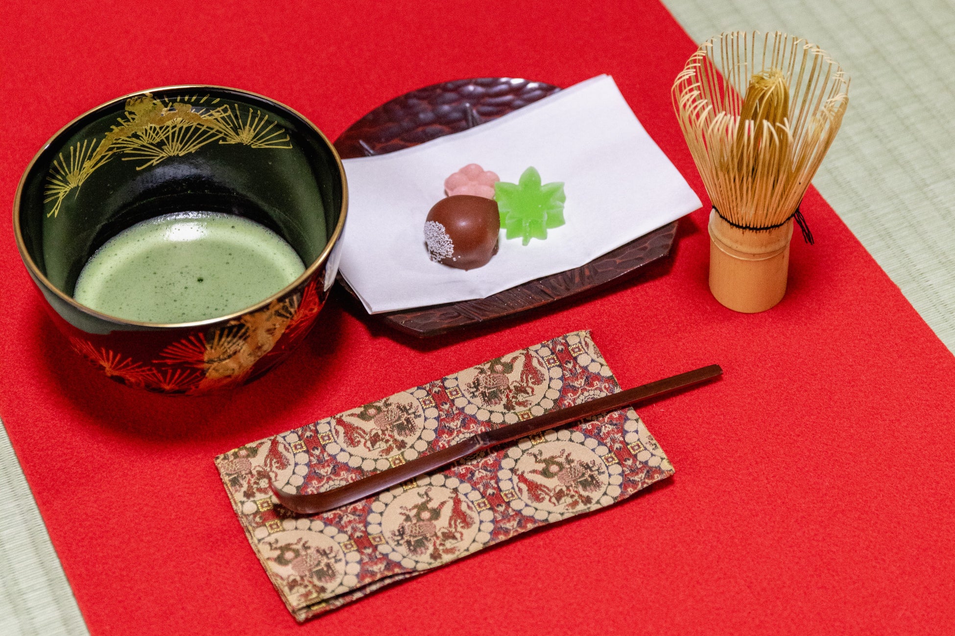 京都産の抹茶とお菓子、清水焼の茶碗を使用