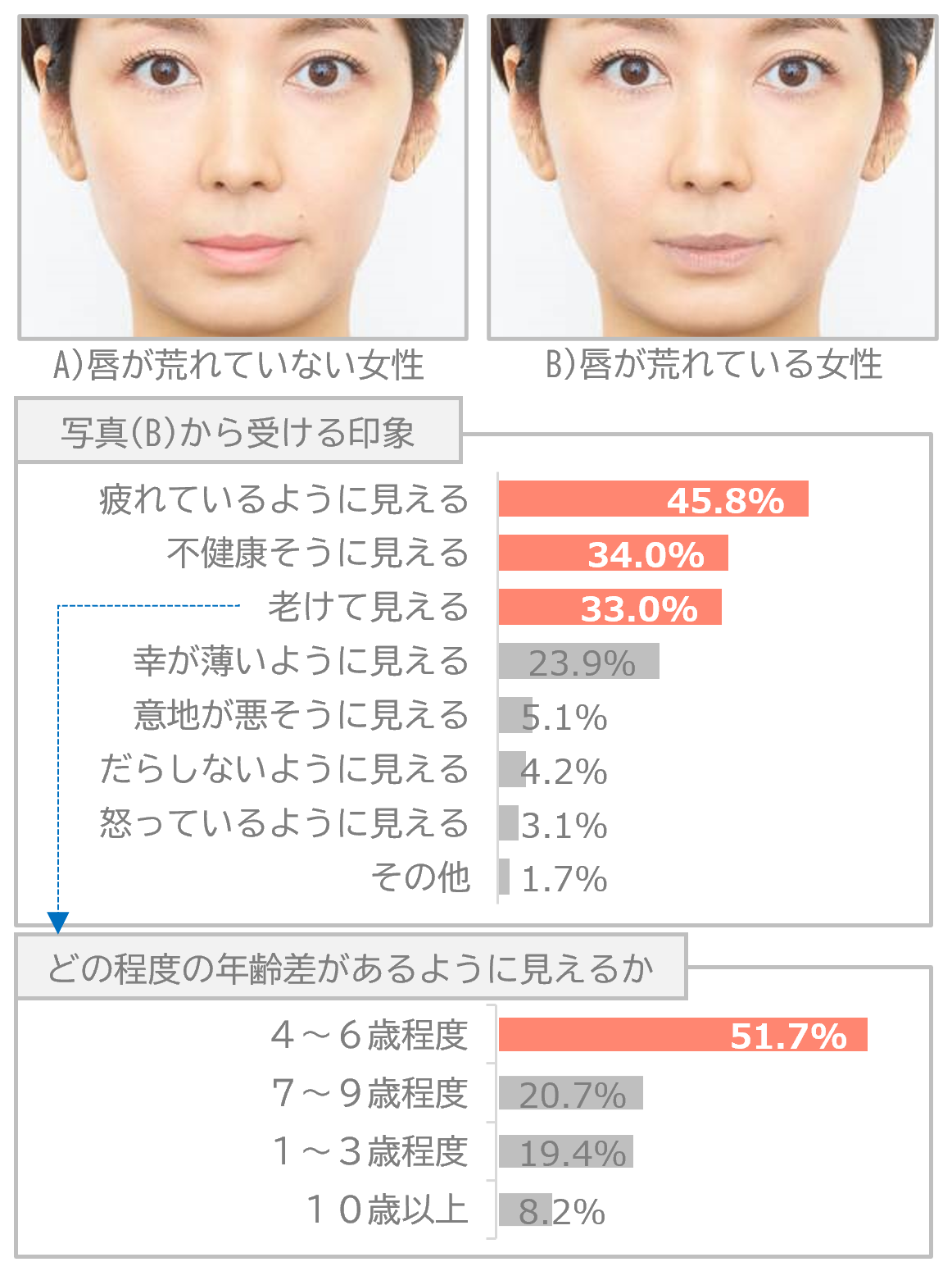 たった唇だけの違いにも関わらず、回答者の約半数が写真(B)を見て「疲れているように見える」と回答。