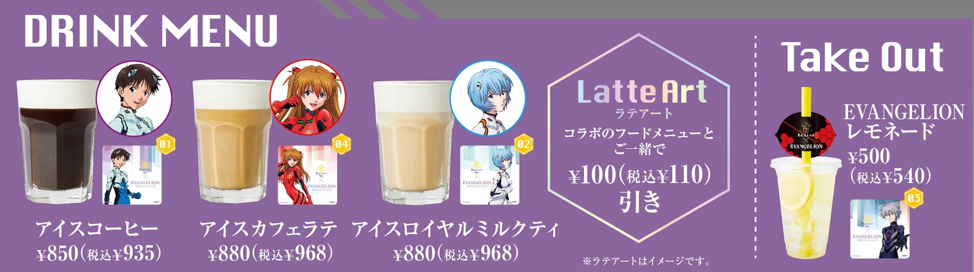 【アイスコーヒー「碇シンジ」】 935円、【アイスカフェラテ「式波・アスカ・ラングレー」】 968円、【アイスロイヤルミルクティ「綾波レイ」】 968円 の3種類ご用意しました。