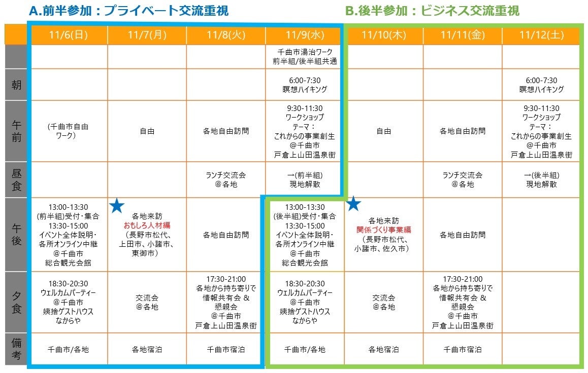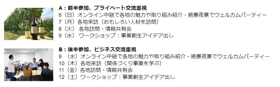 新規出店が相次ぐ北国街道小諸宿レトロなまちの取り組みを学び、古民家やワイナリーでワーケーションを体験し、仕事終わりにはワインと地元食材のペアリングを楽しめます。「おしゃれ田舎プロジェクト」の紹介、また「ワインツーリズムの夜明け」と題して産業と文化の定着に向けたアイディア出しへの参加など、交流も魅力です。