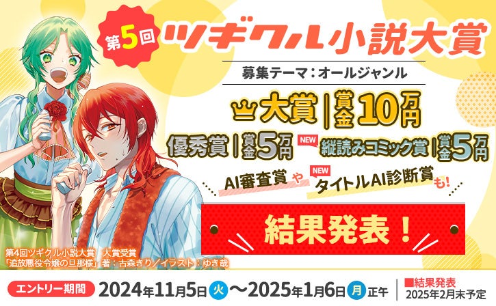 「第5回ツギクル小説大賞」は、ウェブ上にある新たな作品の発掘を目的としたコンテストで、2024 年 11 月 5 日より 2025 年 1 月 6 日までの間に応募された作品の中から、選出された作品に贈られるもので、ツギクルブックス、ツギクルコミックスにて、ノベルやコミックの出版を進めて参ります。