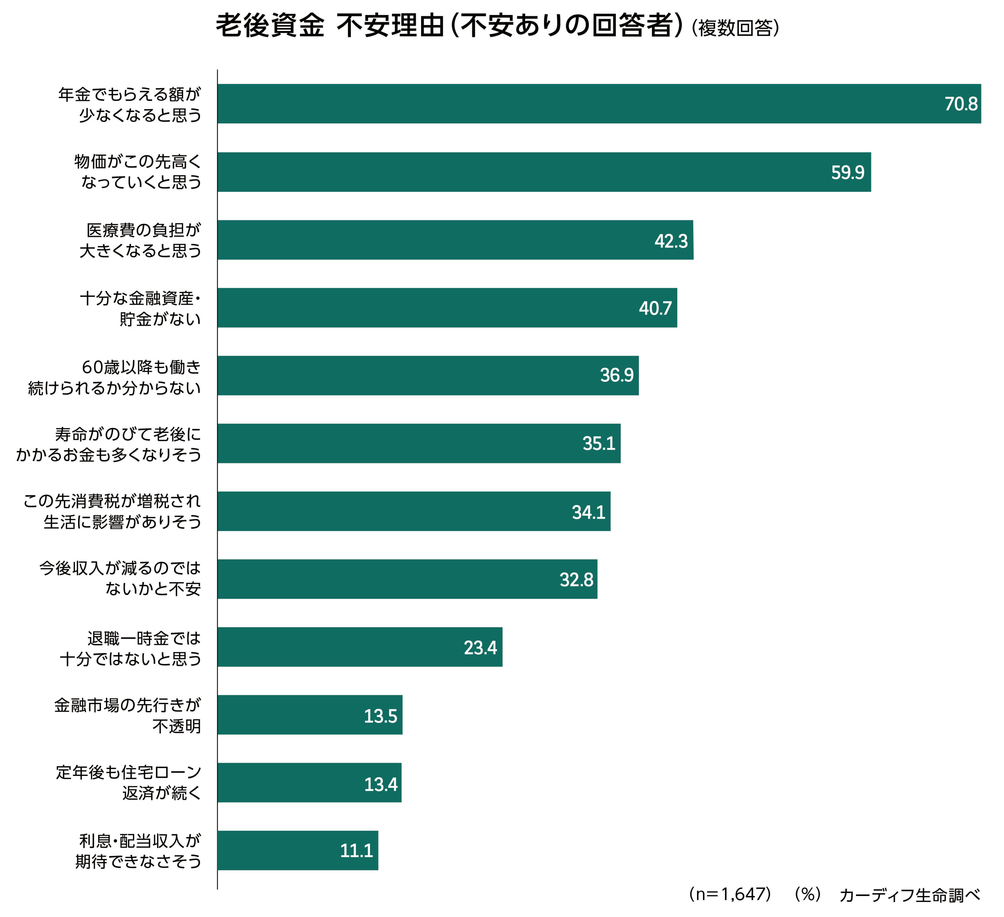 - 「老後資金が不安」は8割超。主な理由は「年金額の減少」、「将来の物価上昇」、「医療費負担の増大」