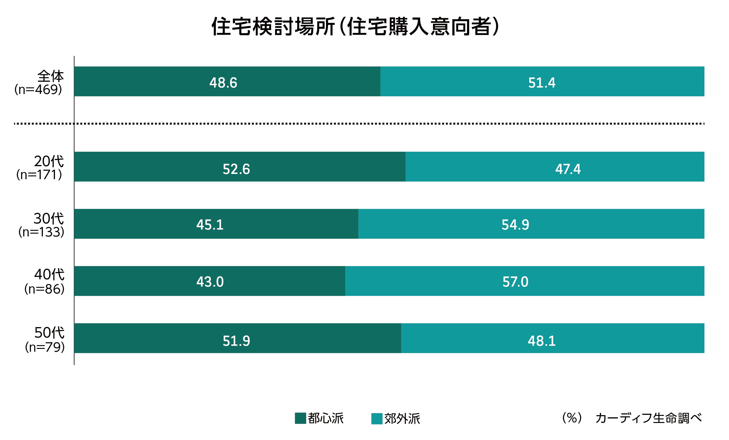 - 住宅購入意向のある人のうち、「都心派」は49%、「郊外派」は51%と拮抗(図表3-2)。